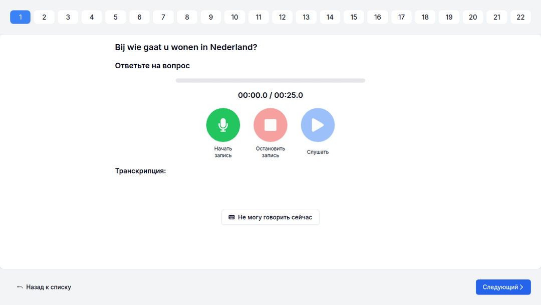 Преобразите свою подготовку к Базовому экзамену по гражданской интеграции за рубежом (Basisexamen Inburgering in het Buitenland). Погрузитесь в реалистичную практику по разделам «Знания о нидерландском обществе» (KNS), «Говорение» (Spreken) и «Чтение» (Lezen). Это ваш пропуск в Нидерланды — ещё до того, как вы ступите на нидерландскую землю. Сделайте его по‑настоящему результативным!